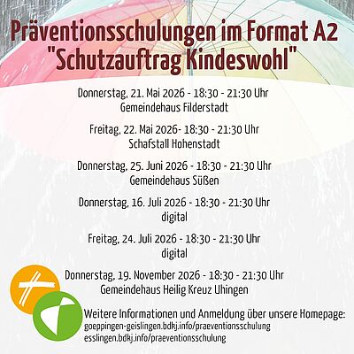 Die Kath. Erwachsenenbildung hat ebenfalls Präventionsschulungen im Angebot, falls es terminlich mal nicht passen sollte. Hier findet ihr die Terminübersicht des Dekanats Göppingen-Geislingen.